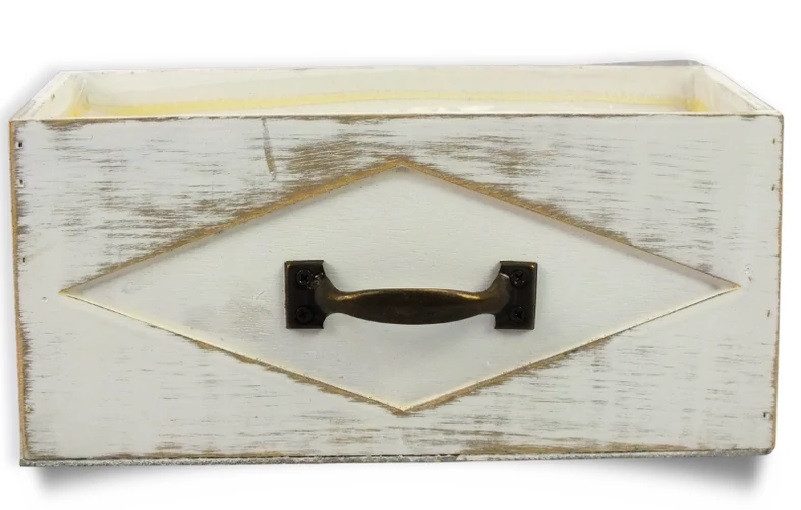 A fehér fa fiók fogantyúval, enyhén koptatott felülettel és bélelt belső résszel készül, így dekorációs és praktikus célokra egyaránt alkalmas.