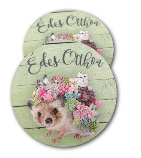 Fa tábla - Édes otthon zöld sünis - 7x7 cm