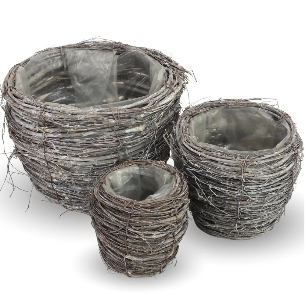 Természetes hatású, fonott indából készült kaspó szett három különböző méretben.
