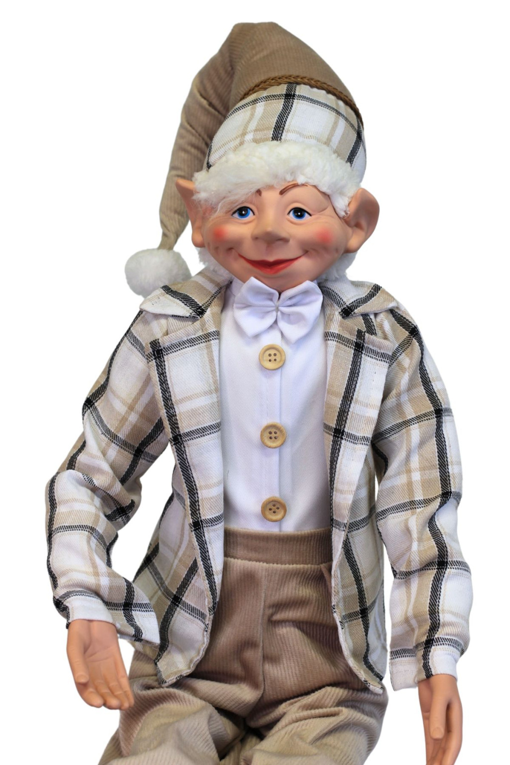 Ülő karácsonyi manó elegáns öltözékben, ideális dekoráció a fára, a gyerekszobába vagy a kandallóra.
