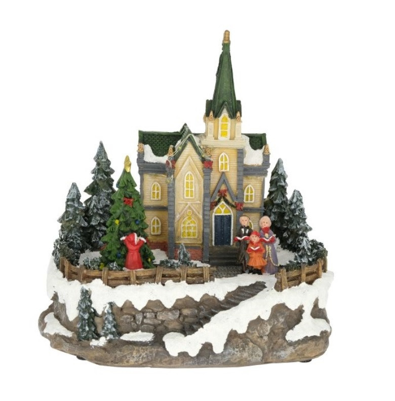 Karácsonyi jelenet templom, mozgó fenyővel, LED-es - 20x16x20,5 cm