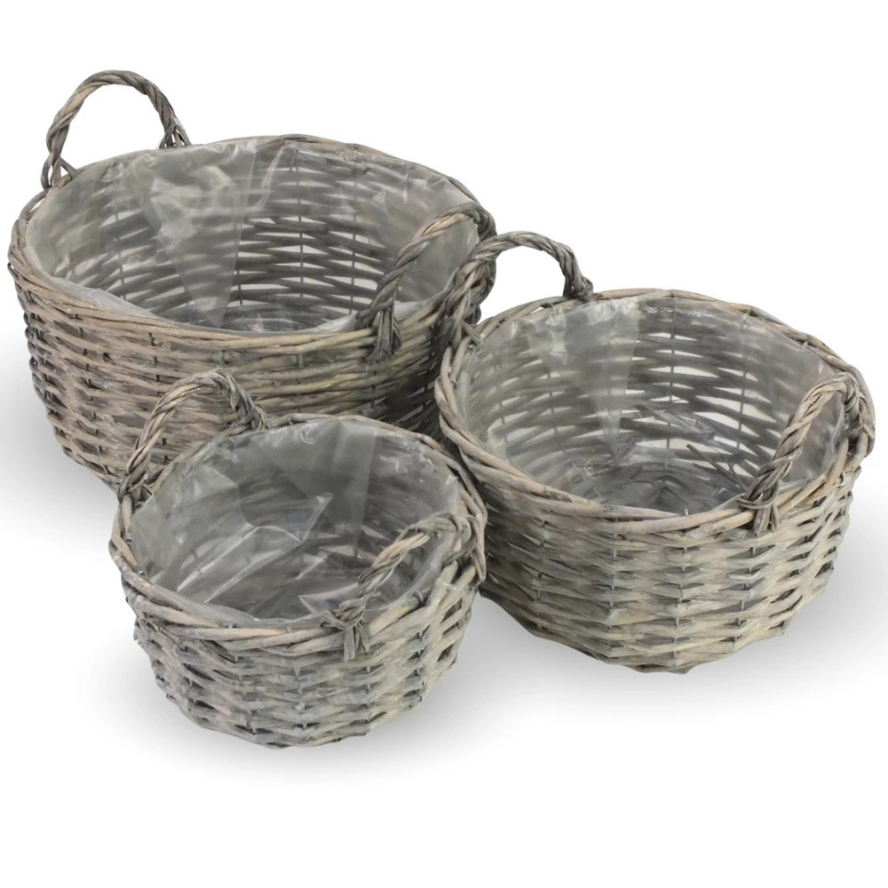 Természetes stílusú, kerek formájú, füles vessző fonott tál szett három különböző méretben.