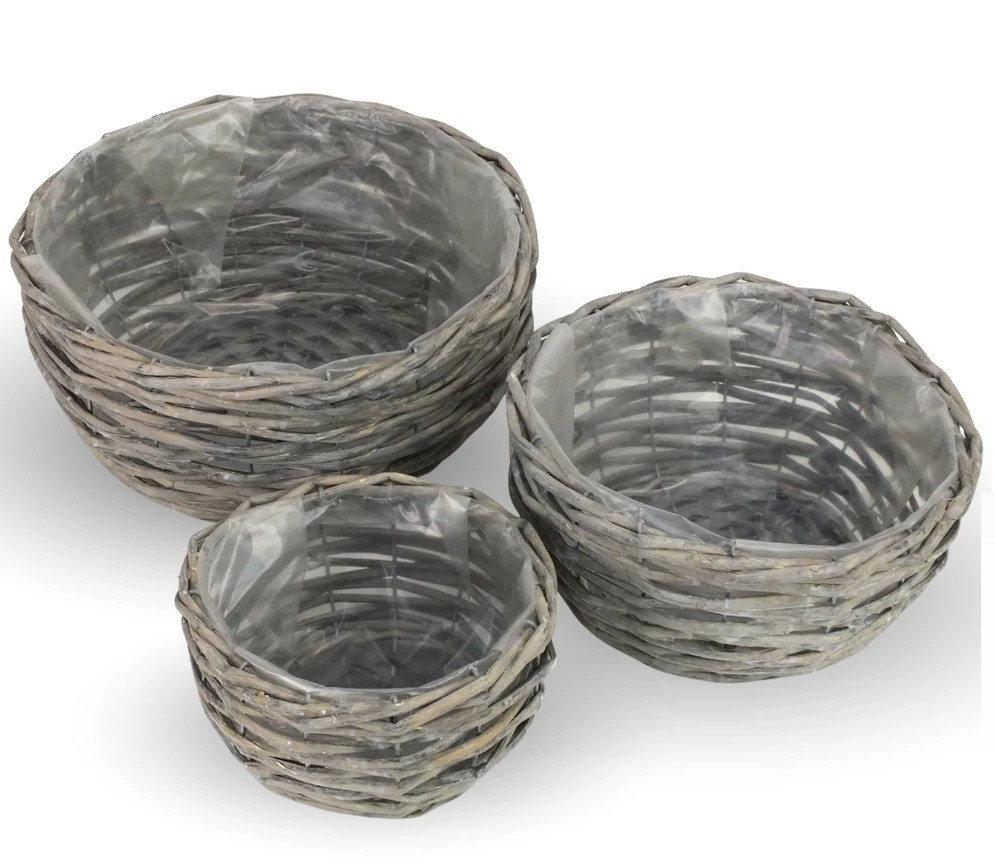 Dekoratív, természetes hatású fonott kaspó szett, amely három különböző méretű, fóliával bélelt kaspót tartalmaz. Tökéletes választás virágok, növények vagy dekorációs kompozíciók elhelyezéséhez. A bélés megvédi a fonott anyagot a nedvességtől, így élő növényekhez is használható.