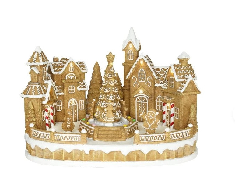 Mézeskalács város fenyővel, mozgó figurákkal, LED-es 31,5x20,3x22,5 cm