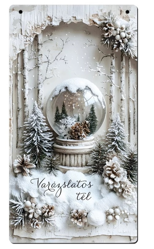 Nyomtatott fa tábla - Vintage fehér téma - hógömb - 13x24,3cm