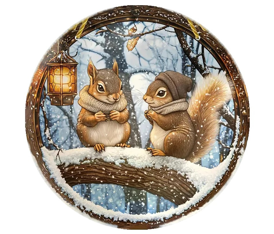 Nyomtatott fa tábla koszorú közép - Két mókus - 11,8 cm, 14,8 cm