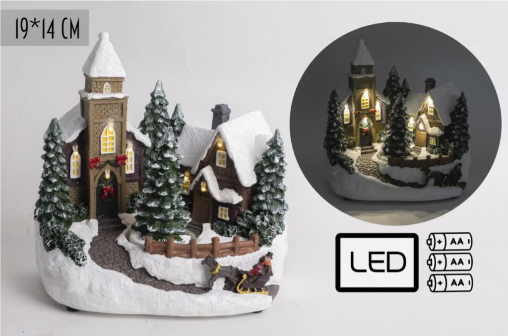Karácsonyi templom forgó fenyőfával - 19x14 cm