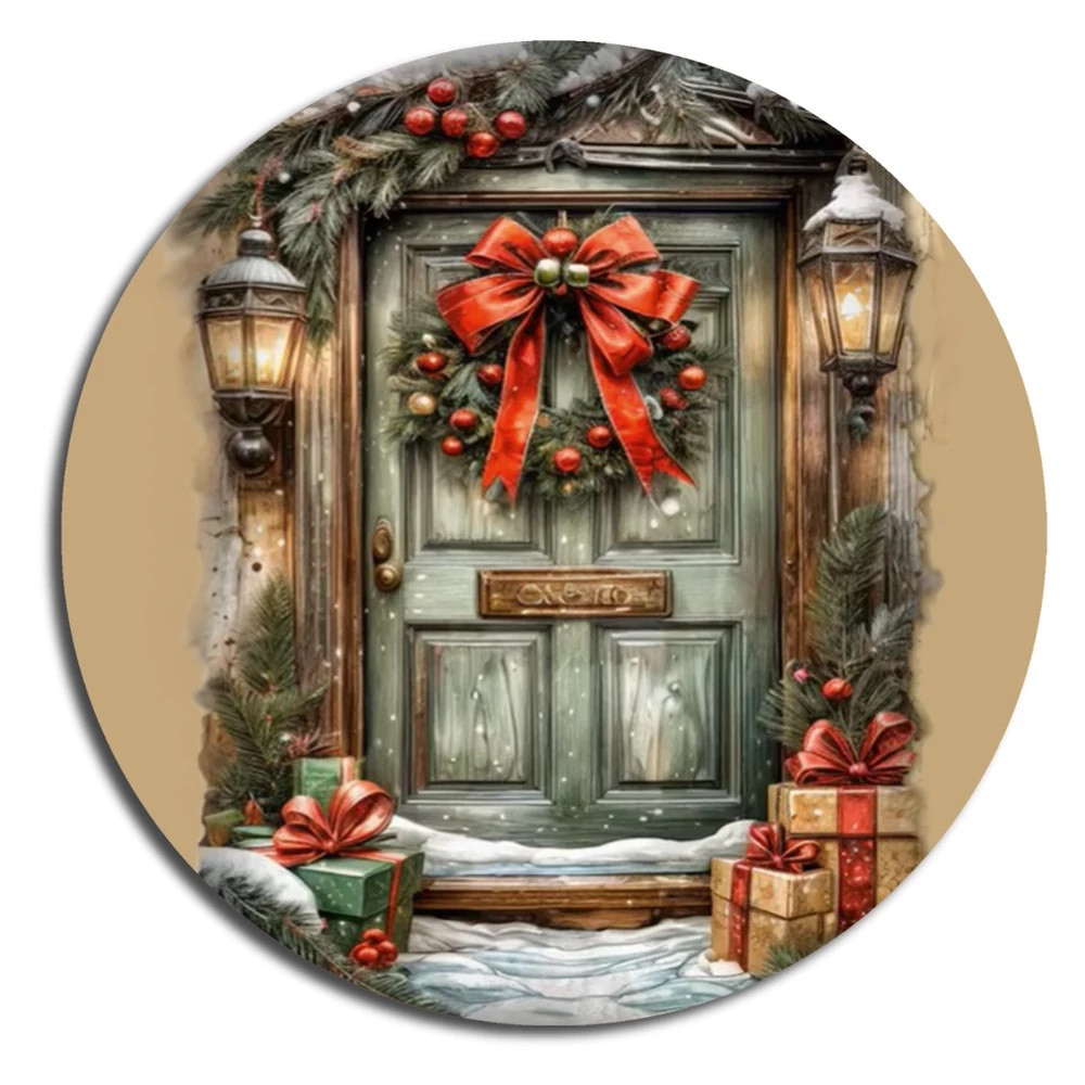 Nyomtatott fa tábla koszorú közép - Piros autós karácsonyi - 11,8 cm