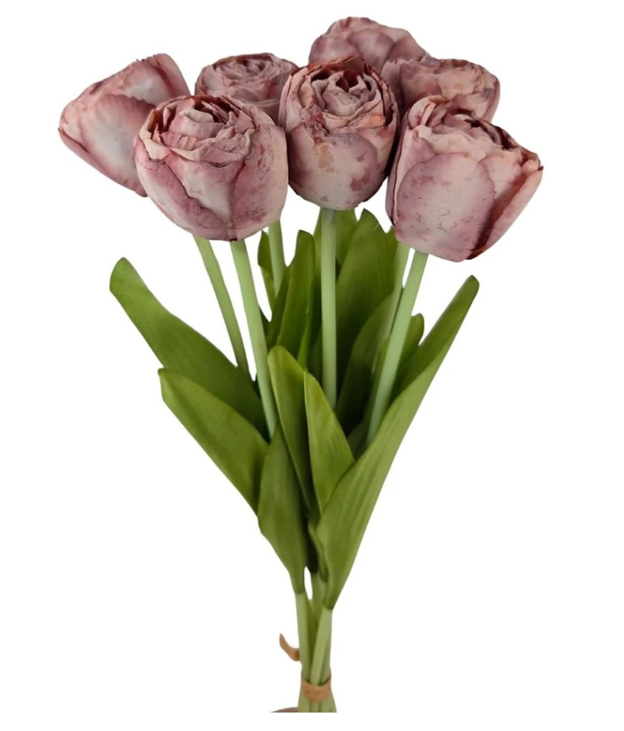 7 szálas szárított hatású tulipán csokor - Antik mályva - 43 cm